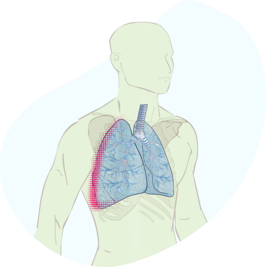 - Mesotelioma pleurico. Rappresenta circa il 90% dei casi di mesotelioma. Si sviluppa inizialmente nello spazio pleurico, che comprende la membrana che riveste la parte interna della gabbia toracica (pleura parietale), la membrana che riveste i polmoni (pleura viscerale), e lo spazio tra le due membrane, che in un soggetto sano contiene una modesta quantità di liquido pleurico (che lubrifica le due pleure e facilita l’espansione dei polmoni). Il mesotelioma pleurico può poi estendersi ai polmoni o ad altre aree della cavità toracica.