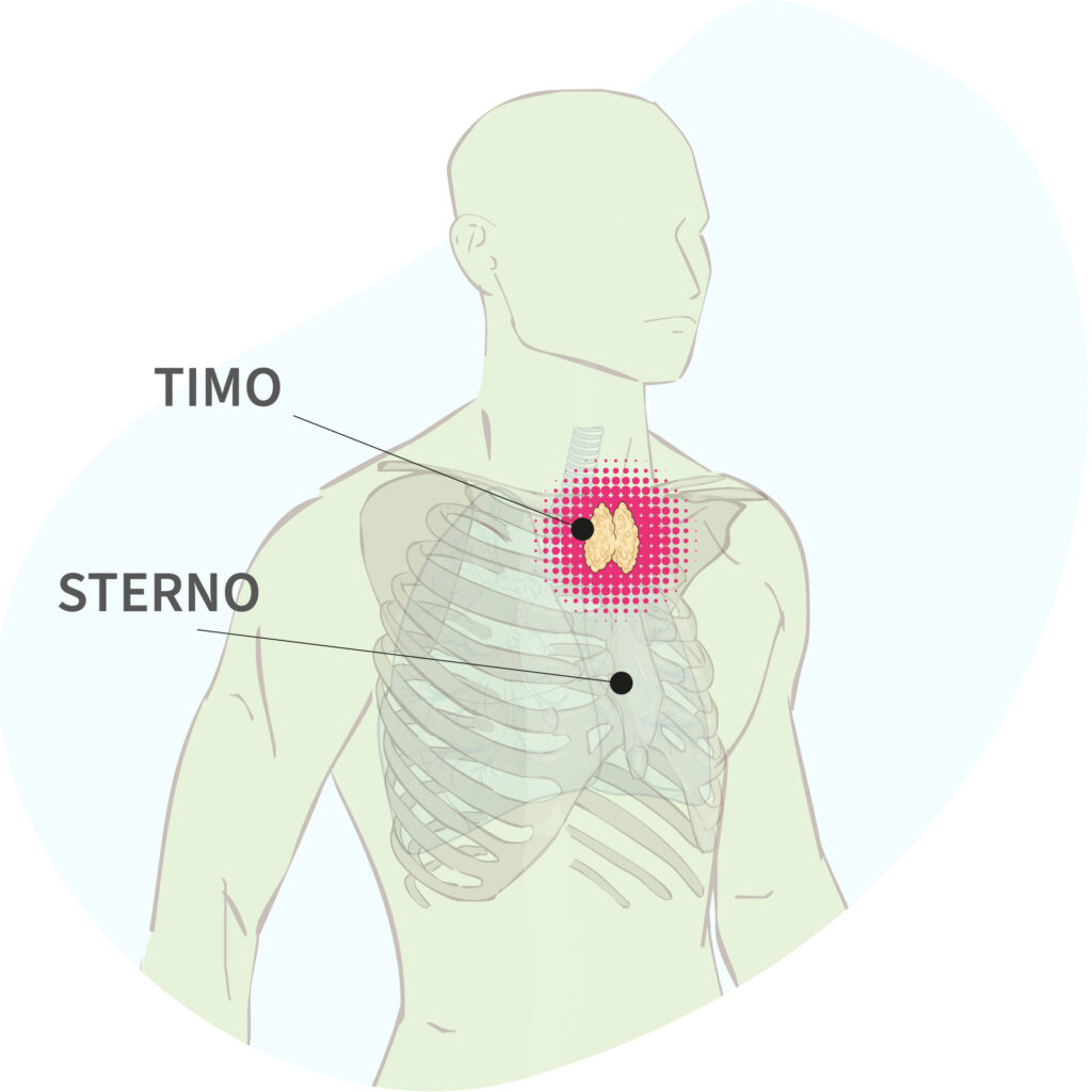 Il timoma si sviluppa nel timo, un organo fondamentale per il sistema immunitario di ciascun individuo. Per questo motivo, i tumori del timo, e in particolare i timomi, possono essere associati, in circa 1 caso su 3, a malattie autoimmuni, cioè patologie in cui il sistema immunitario aggredisce organi o tessuti sani dell’organismo. Queste malattie autoimmuni sono definite paraneoplastiche perché non sono una forma di cancro, ma si possono sviluppare a causa della presenza di un tumore nell’organismo.